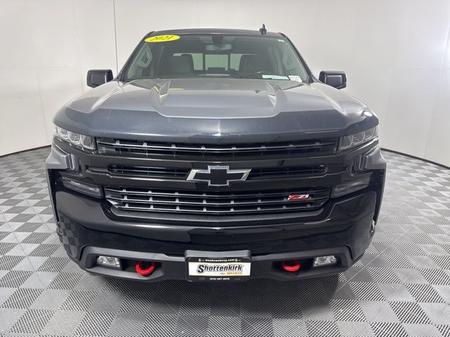 Recent Arrival! CARFAX One-Owner. Satin Steel Metallic 2021 Chevrolet Silverado 1500 LT Trail Boss w/Sunroof 4D Crew Cab EcoTec3 5.3L V8 4WD 10-Speed Automatic 10-Way Power Driver Seat w/Lumbar, 12-Volt Rear Auxiliary Power Outlet, 120-Volt Bed Mounted Power Outlet, 120-Volt Instrument Panel Power Outlet, 170 Amp Alternator, 2 USB Ports, 2 USB Ports (First Row), 4.2" Diagonal Color Display Driver Info Center, 4G LTE Wi-Fi Hot Spot Capable, 6-Speaker Audio System, All-Weather Floor Liner (LPO) (AAK), Auto-Locking Rear Differential, Auxiliary External Transmission Oil Cooler, Bluetooth® For Phone, Chevrolet Connected Access Capable, Color-Keyed Carpeting Floor Covering, Compass, Convenience Package II, Convenience Package w/Buckets Seats, Deep-Tinted Glass, Dual Exhaust w/Polished Outlets, Dual-Zone Automatic Climate Control, Electric Rear-Window Defogger, Electrical Lock Control Steering Column, Electronic Cruise Control, EZ Lift Power Lock & Release Tailgate, Floor Mounted Center Console, Front LED Fog Lamps, HD Radio, HD Rear Vision Camera, Heated Driver & Front Outboard Passenger Seats, Heated Steering Wheel, Heavy-Duty Air Filter, High Gloss Black Grille, High Gloss Black Mirror Caps, Hill Descent Control, Hitch Guidance, Keyless Open & Start, Leather Wrapped Steering Wheel, LED Cargo Area Lighting, LED Reflector Headlamps, Manual Tilt/Telescoping Steering Column, OnStar & Chevrolet Connected Services Capable, Performance Red Recovery Hooks, Power Door Locks, Power Front Windows w/Driver Express Up/Down, Power Front Windows w/Passenger Express Down, Power Rear Windows w/Express Down, Power Sliding Rear Window w/Rear Defogger, Preferred Equipment Group 2LT, Premium Bose 7-Speaker Sound System, Radio: Chevrolet Infotainment 3 Plus System, Rear Dual USB Charging-Only Ports, Rear Vision Camera, Remote Vehicle Starter System, SiriusXM Radio, SiriusXM w/360L, Standard Tailgate, Steering Wheel Audio Controls, SUNROOF, Suspension Package, Theft Deterrent System (Unauthorized Entry), Trailering Package, Universal Home Remote, Wireless Phone Projection.