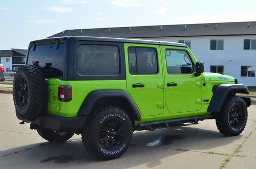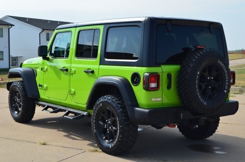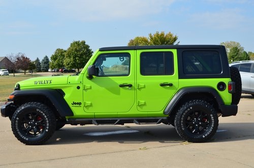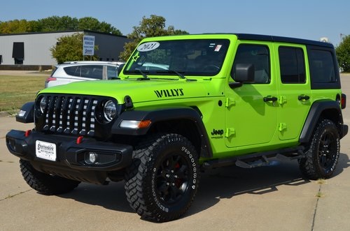2021 Jeep Wrangler Unlimited Willys Limited Edition Gecko Clear Coat 4D Sport Utility 3.6L V6 24V VVT 8-Speed Automatic 4WD Unlimited Willys This vehicle comes well equipped with Convenience Group, Quick Order Package 24W Willys (4-Wheel Drive Swing Gate Decal, Anti-Spin Differential Rear Axle, Automatic Headlamps, Black Grille, Black Trail Rated Badge, Leather Wrapped Steering Wheel, Matte Black Jeep Badge, Mold In Color Bumper w/Gloss Black, Power Heated Mirrors, Remote Keyless Entry, Speed Sensitive Power Locks, Sun Visors w/Illuminated Vanity Mirrors, Willys Hood Decal, and Wrangler Decal), Trailer Tow & HD Electrical Group, 3.45 Rear Axle Ratio, 4-Wheel Disc Brakes, 8 Speakers, ABS brakes, Air Conditioning, AM/FM radio, Aux Battery, Black 3-Piece Hard Top, Brake assist, Cloth Low-Back Bucket Seats, Compass, Delay-off headlights, Driver door bin, Driver vanity mirror, Dual front impact airbags, Dual front side impact airbags, Electronic Stability Control, Front anti-roll bar, Front Bucket Seats, Front Center Armrest w/Storage, Front fog lights, Front reading lights, Integrated roll-over protection, Low tire pressure warning, MOPAR All-Weather Floor Mats (DISC), No Soft Top, Non-Lock Fuel Cap w/o Discriminator, Normal Duty Suspension, Occupant sensing airbag, Outside temperature display, ParkView Rear Back-Up Camera, Passenger door bin, Passenger vanity mirror, Power steering, Radio data system, Radio: Uconnect 3 w/5" Display, Rear anti-roll bar, Rear reading lights, Speed control, Split folding rear seat, Steering wheel mounted audio controls, Stop-Start Dual Battery System, Tachometer, Telescoping steering wheel, Tilt steering wheel, Traction control, Trip computer, Variably intermittent wipers, and Wheels: 17" x 7.5" Black Steel Styled. Odometer is 15394 miles below market average!