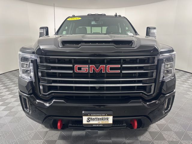 CARFAX One-Owner. Onyx Black 2022 GMC Sierra 2500HD AT4 w/Sunroof 4D Crew Cab 6.6L V8 4WD 6-Speed Automatic 12-Volt Rear Auxiliary Power Outlet, 120-Volt Bed Mounted Power Outlet, 120-Volt Instrument Panel Power Outlet, 2 USB Ports, 2 USB Ports (1st Row), 2-Speed Active Transfer Case, 2nd Row Dual USB Charge-Only Ports, 4.2" Diagonal Color Display Driver Info Center, AT4 Preferred Package, Automatic Emergency Braking, Bed View Camera w/2 Trailer Camera Provisions, Bose Premium 7 Speaker Sound System, Compass Located In Instrument Cluster, Deep-Tinted Glass, Driver Alert Package I, Driver Alert Package II, Electric Rear-Window Defogger, Electrical Lock Control Steering Column, Floor-Mounted Center Console, Following Distance Indicator, Forward Collision Alert, Front Prem Floor Liners w/Removable Carpet Insert, GMC Connected Access Capable, Gooseneck/5th Wheel Package, Gooseneck/5th Wheel Prep Package, HD Rear Vision Camera, HD Surround Vision w/2 Trailer View Camera Provisions, Heated & Ventilated Front Bucket Seats, Heated Driver & Front Outboard Passenger Seats, Hill Descent Control, Integrated Trailer Brake Controller, IntelliBeam Automatic High Beam On/Off, Keyless Open & Start, Lane Change Alert w/Side Blind Zone Alert, Lane Departure Warning System, LEATHER, LED Cargo Area Lighting, LED Smoked Amber Roof Marker Lamps, Manual Tilt-Wheel/Telescoping Steering Column, OnStar & GMC Connected Services Capable, Painted Black Surround Grille, Perimeter Lighting, Power Door Locks, Power Front Passenger Windows w/Express Up/Down, Power Rear Windows w/Express Down, Power Sliding Rear Window w/Defogger, Power Windows w/Driver Express Up/Down, Preferred Equipment Group 4SB, Radio: AM/FM w/Prem GMC Infotainment System & Navi, Rear Cross Traffic Alert, Rear Prem Floor Liners w/Removable Carpet Insert, Rear Wheelhouse Liners, Red Recovery Hooks, Remote Vehicle Starter System, Safety Alert Seat, Spray-On Pickup Box Bed Liner w/AT4 Logo, Steering Wheel Audio Controls, SUNROOF, Ultrasonic Front & Rear Park Assist, Unauthorized Entry Theft-Deterrent System, Universal Home Remote, Wi-Fi Hotspot Capable, Wireless Charging, Wireless Phone Projection, X31 Off-Road Package. Clean CARFAX.