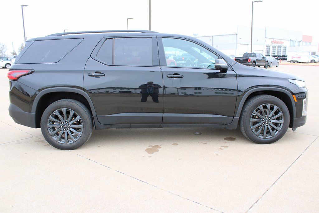 2023 Chevrolet Traverse RS Mosaic Black Metallic 4D Sport Utility 3.6L V6 SIDI VVT 9-Speed Automatic AWD RS This vehicle comes well equipped with Front License Plate Bracket Mounting Package, Preferred Equipment Group 2LT (Heated Driver & Front Passenger Seats), 10 Speakers, 3.49 Axle Ratio, 3rd row seats: split-bench, 4-Wheel Disc Brakes, 6-Way Power Front Passenger Seat, 8-Way Power Driver Seat Adjuster, ABS brakes, Air Conditioning, Alloy wheels, AM/FM radio: SiriusXM with 360L, Apple CarPlay/Android Auto, Auto High-beam Headlights, Auto-dimming Rear-View mirror, Automatic temperature control, Bose Premium 10-Speaker Audio System Feature, Brake assist, Bumpers: body-color, Compass, Delay-off headlights, Driver door bin, Driver vanity mirror, Dual front impact airbags, Dual front side impact airbags, Dual SkyScape 2-Panel Power Sunroof, Electronic Stability Control, Emergency communication system, Exterior Parking Camera Rear, Four wheel independent suspension, Front anti-roll bar, Front Bucket Seats, Front Center Armrest, Front dual zone A/C, Front Passenger 2-Way Power Lumbar, Front reading lights, Fully automatic headlights, Garage door transmitter, Heated door mirrors, Heated front seats, Heated steering wheel, Illuminated entry, Leather steering wheel, Low tire pressure warning, Navigation System, Not Equipped w/Rear Park Assist (060), Occupant sensing airbag, Outside temperature display, Overhead airbag, Overhead console, Panic alarm, Passenger door bin, Passenger vanity mirror, Perforated Leather-Appointed Seat Trim, Power door mirrors, Power Driver Lumbar Control, Power driver seat, Power Liftgate, Power passenger seat, Power steering, Power windows, Premium audio system: Chevrolet Infotainment 3 Plus, Radio data system, Radio: Chevrolet Infotainment 3 Plus System w/Navi, Rear air conditioning, Rear anti-roll bar, Rear reading lights, Rear window defroster, Rear window wiper, Remote keyless entry, Security system, SiriusXM w/360L, Speed control, Speed-sensing steering, Spoiler, Steering wheel mounted audio controls, Tachometer, Telescoping steering wheel, Tilt steering wheel, Traction control, Trip computer, Turn signal indicator mirrors, Variably intermittent wipers, Voltmeter, and Wheels: 20" Dark Aluminum.